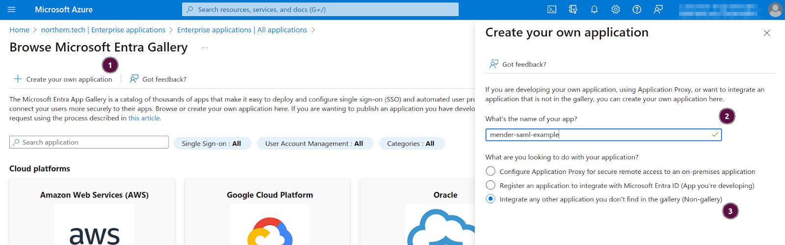 Select the setup for single sign-on. Select SAML on the next screen (not shown in the picture). (1)