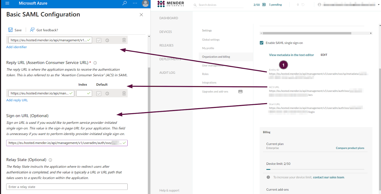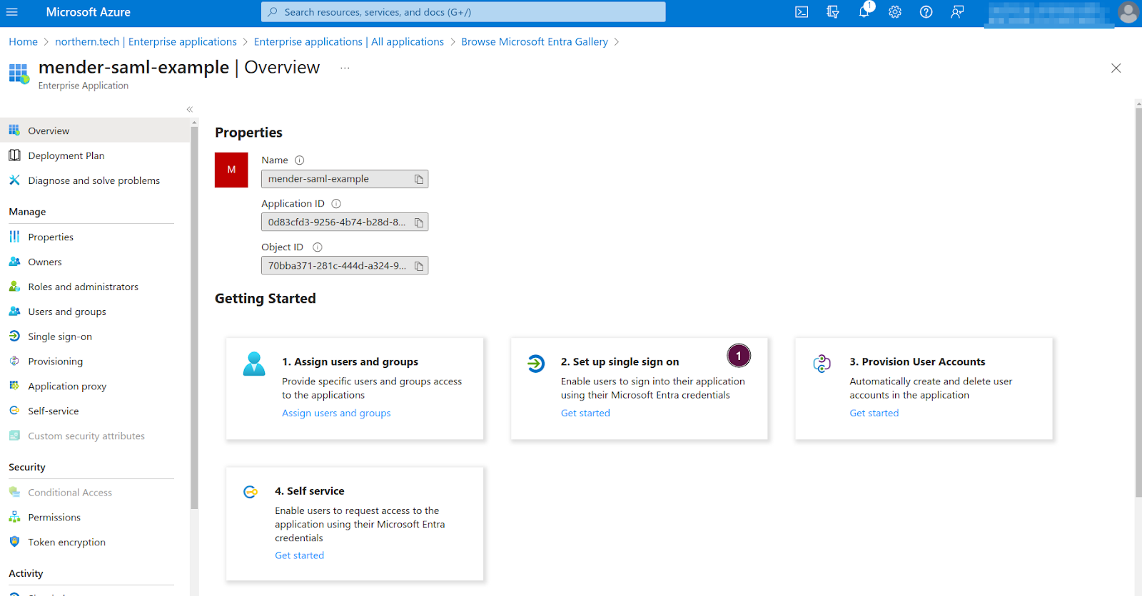 This example will show you how to set Microsoft Entra ID as an Identity Provider (IdP) for hosted Mender as a Service Provider (SP).