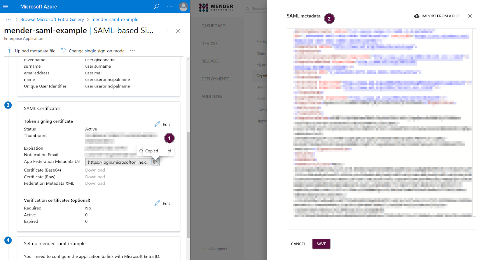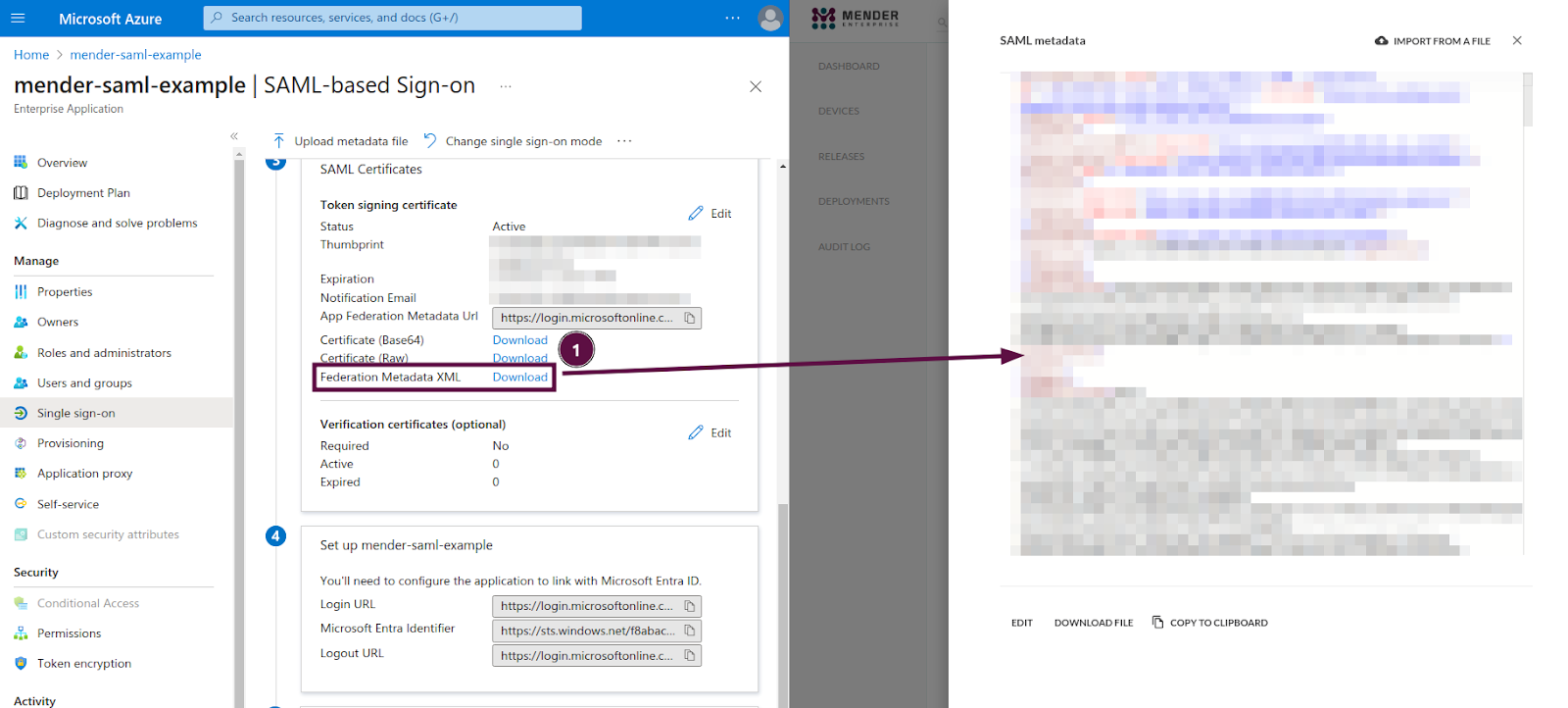 At this point, Microsoft Entra ID will allow the download of the real XML metadata. (1) Replace the XML document you fetched from a URL in the previous step (App Federation Metadata Url) with the one you can download as a file (Federation Metadata XML).