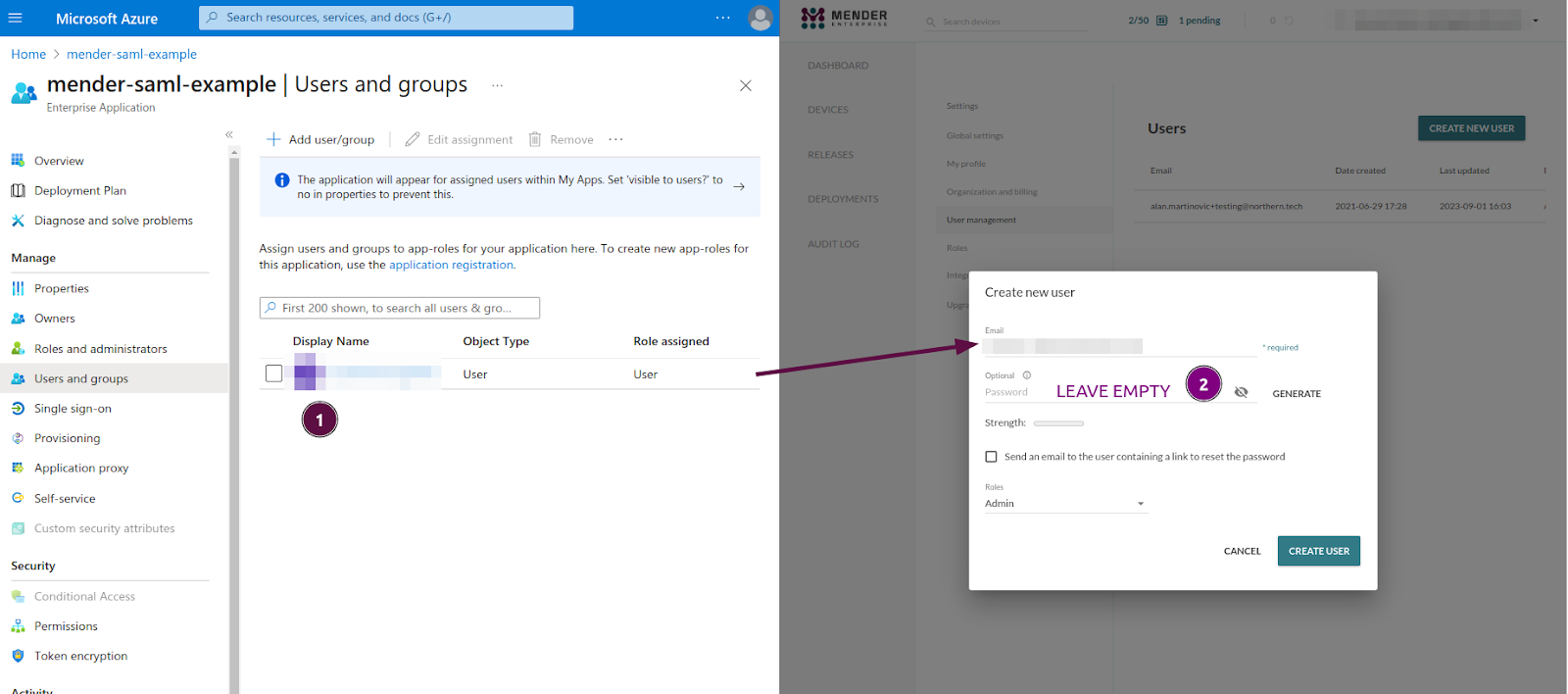 In Mender, create a new user with the Email corresponding to the User principal name